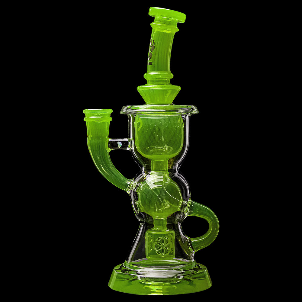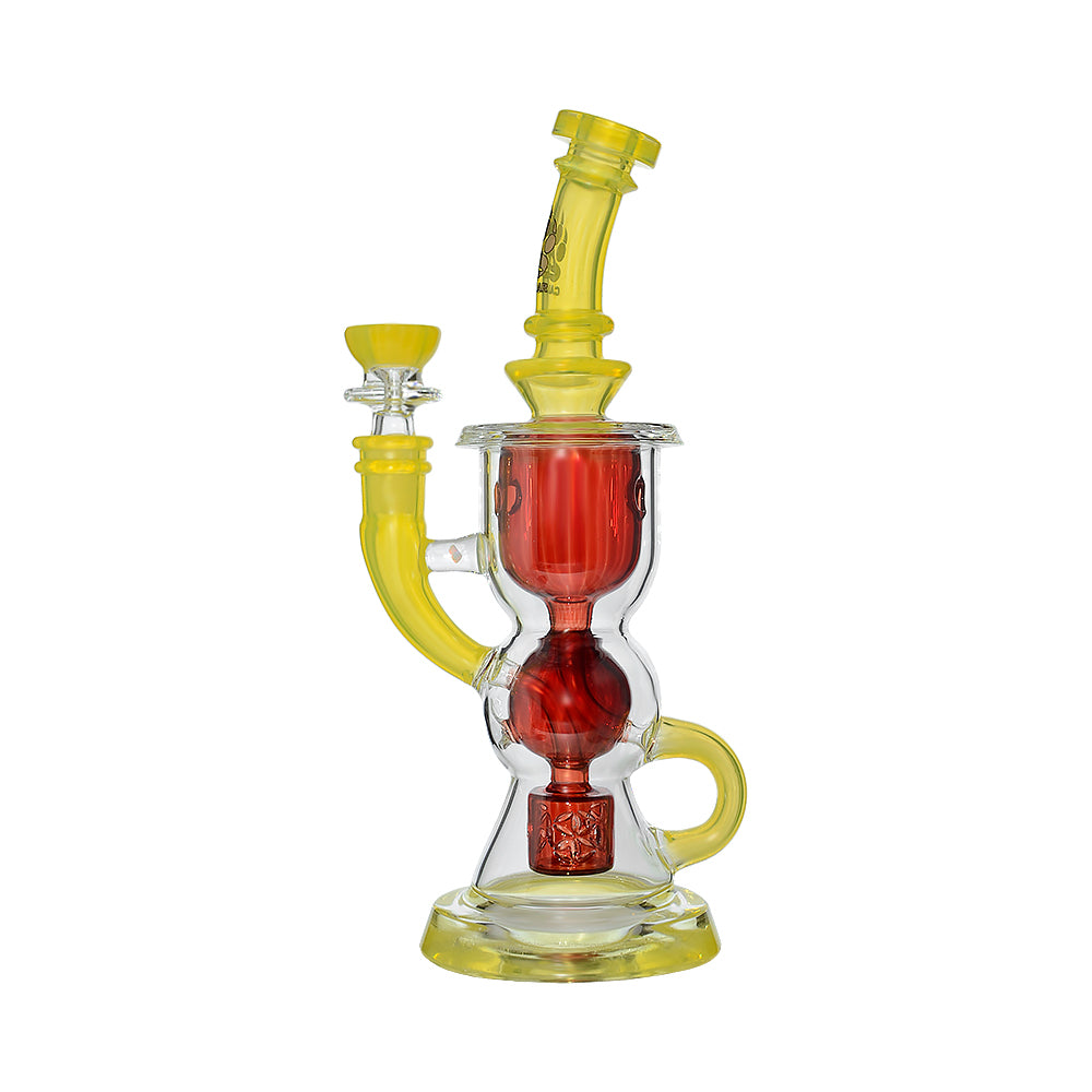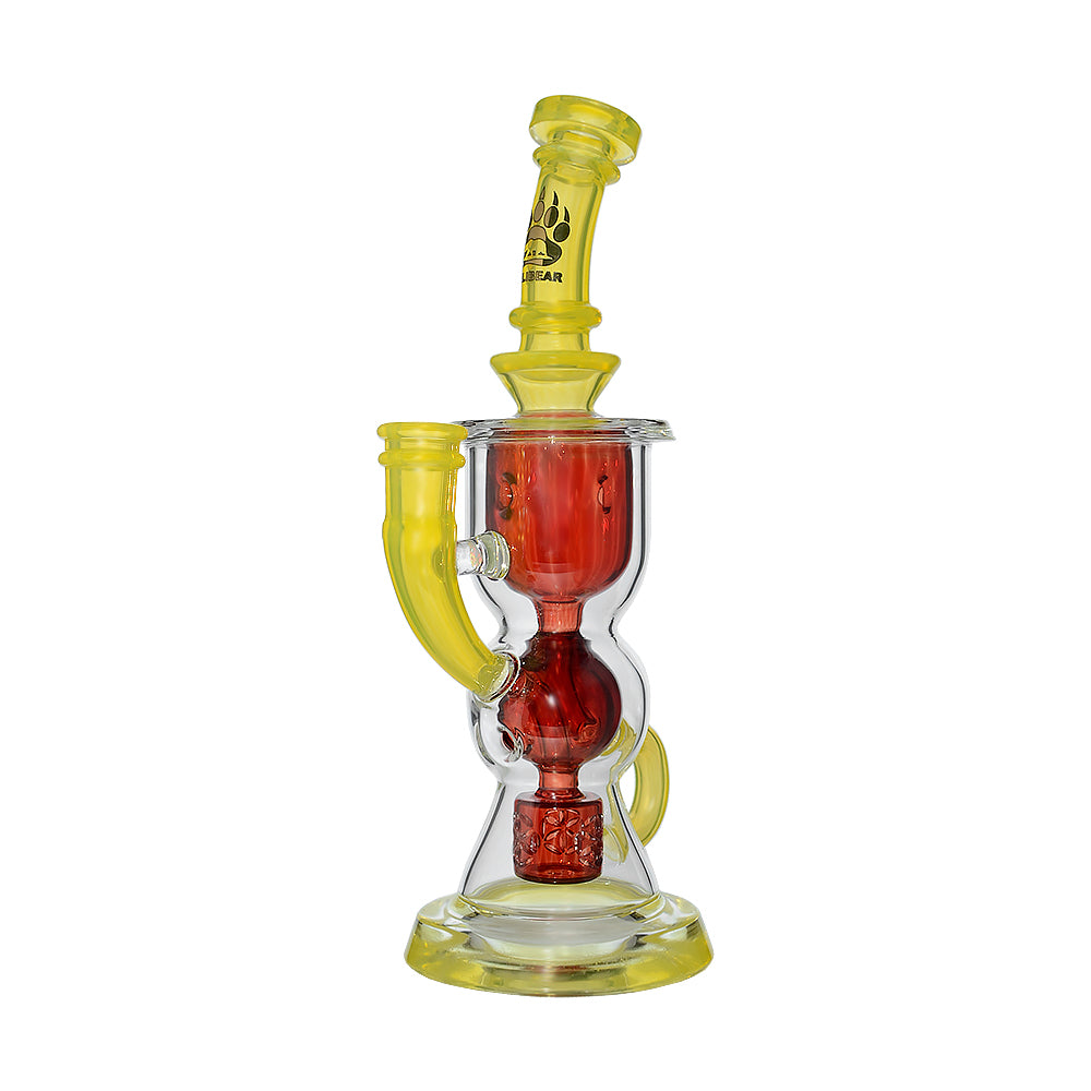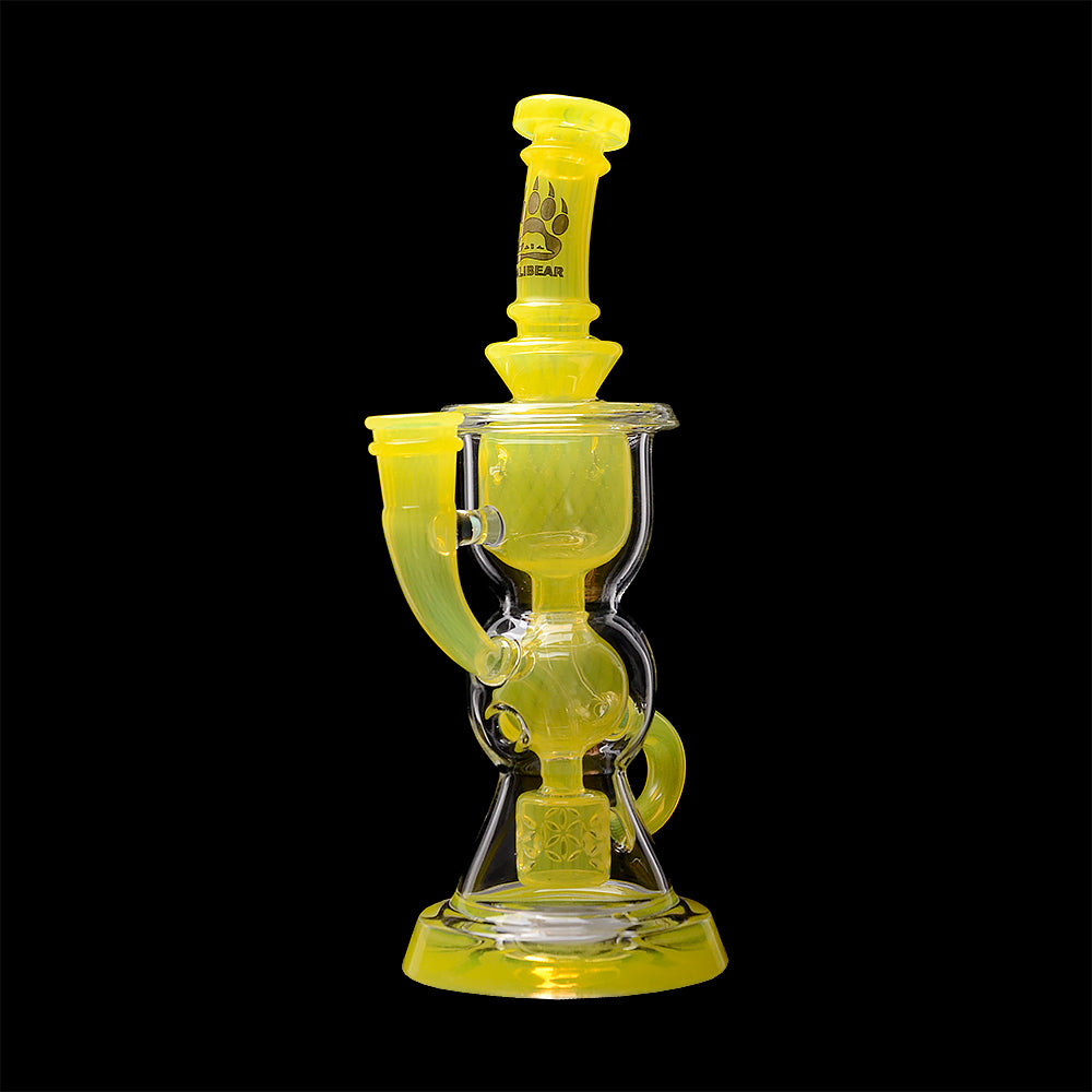 This Calibear dual-tone recycler dab rig showcases premium handcrafted glasswork combined with advanced filtration performance. Featuring a vibrant yellow and lime green colorway, this piece is designed to stand out visually while delivering smooth, flavorful draws.
